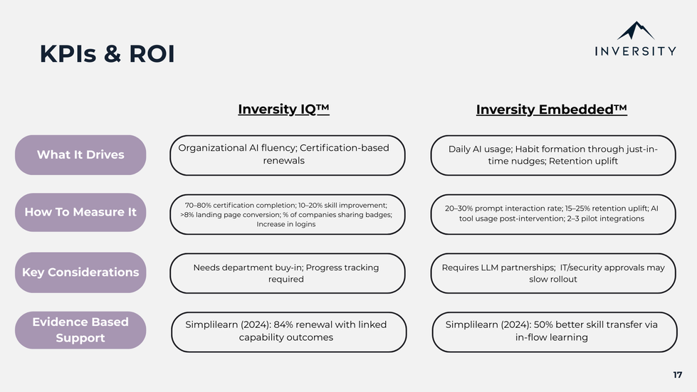 This presentation proposes a retention-focused growth strategy for Inversity, developed as part of a team assignment at Hult International Business School. Addressing Inversity’s core “habit gap”—where learners complete a single course but do not return—we outline a phased roadmap to transform one-off training into sustained, enterprise-wide AI adoption. The proposal introduces two primary solutions and one complementary concept: Inversity IQ™, an enterprise AI Fluency Index and certification program designed to benchmark organizational capability, drive annual renewals, and position Inversity as the trusted standard for AI readiness; Inversity Embedded™, a real-time in-workflow pop-up learning layer that integrates with commonly used LLM tools to deliver just-in-time guidance, reduce repetitive manual work, and encourage daily engagement; and Inversity Challenges™ (appendix), a gamified challenge model to maintain ongoing participation through recruitment, CSR, and internal innovation cycles. Together, these initiatives are evaluated through prioritization, implementation timelines, and success metrics (KPIs and ROI) to support scalable, repeatable customer return and long-term platform stickiness.