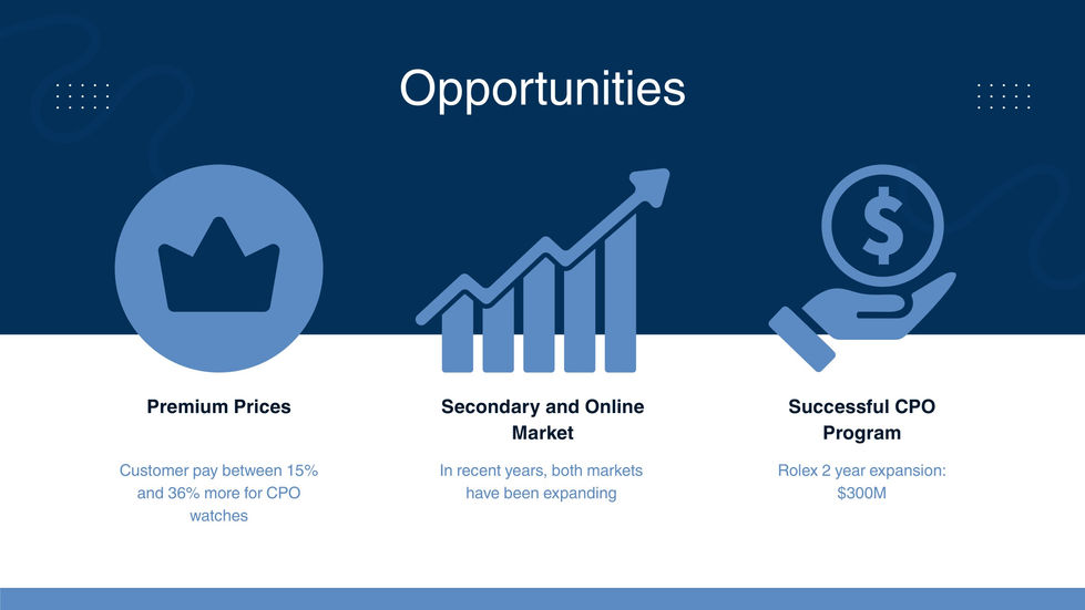We recommend two complementary initiatives. First, an IWC-led Certified Pre-Owned (CPO) program that upgrades older watches into curated, authenticated “heritage” pieces—professionally reviewed, restored, and packaged with renewed warranties to justify premium pricing and close the retail–pre-owned gap. Second, a Richemont–wide CPO framework leveraging Watchfinder and the group’s portfolio to create scale, consistent standards, and stronger market influence. Together, these recommendations aim to capture secondary-market value, increase buyer trust, support circularity, and elevate IWC’s position in the resale ecosystem from “depreciating product” to “generational investment.”